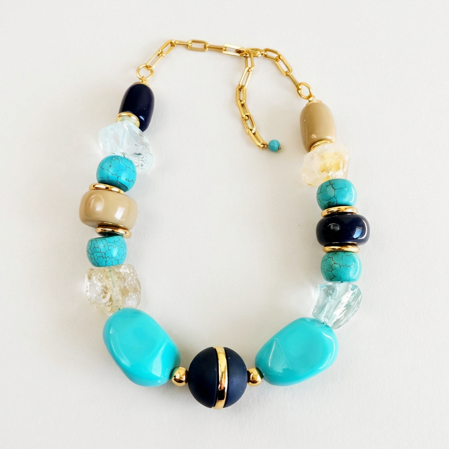 Colar confeccionado com fio encerado, resinas, pedra turquesa, cristal de rocha azul, metais com banho triplo de ouro 18K e camada de verniz italiano que garante o brilho e hipoalergêrnico.