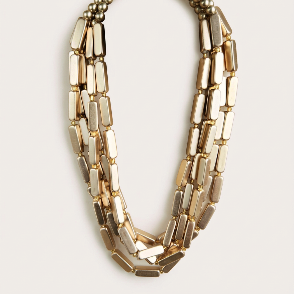 Colar confeccionado com esferas douradas e bastonetes no banho fosco acetinado.