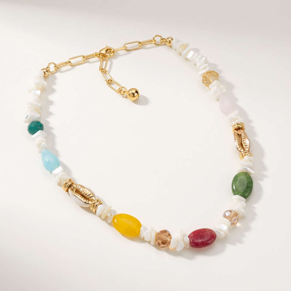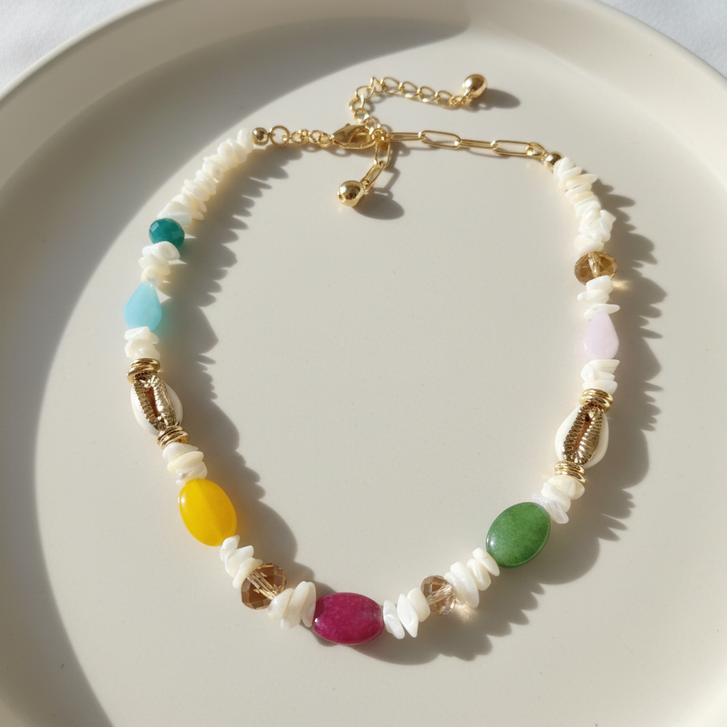 Colar confeccionado com metais banhados a ouro, cascalhos de madre pérola, cristais, pedra jade colorido e buzios.