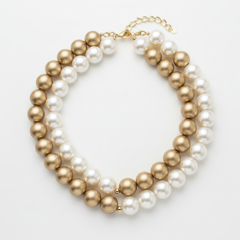 Colar confeccionado com pérolas sintéticas e bolas em ABS. Comprimento 53cm mais 6cm de alongador.
