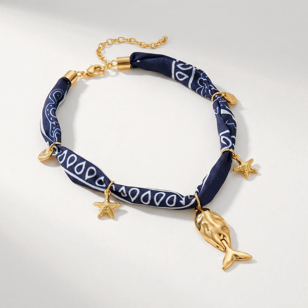 Colar confeccionado com lenço e metal com banho de ouro 18k e camada de verniz hipoalergênico.