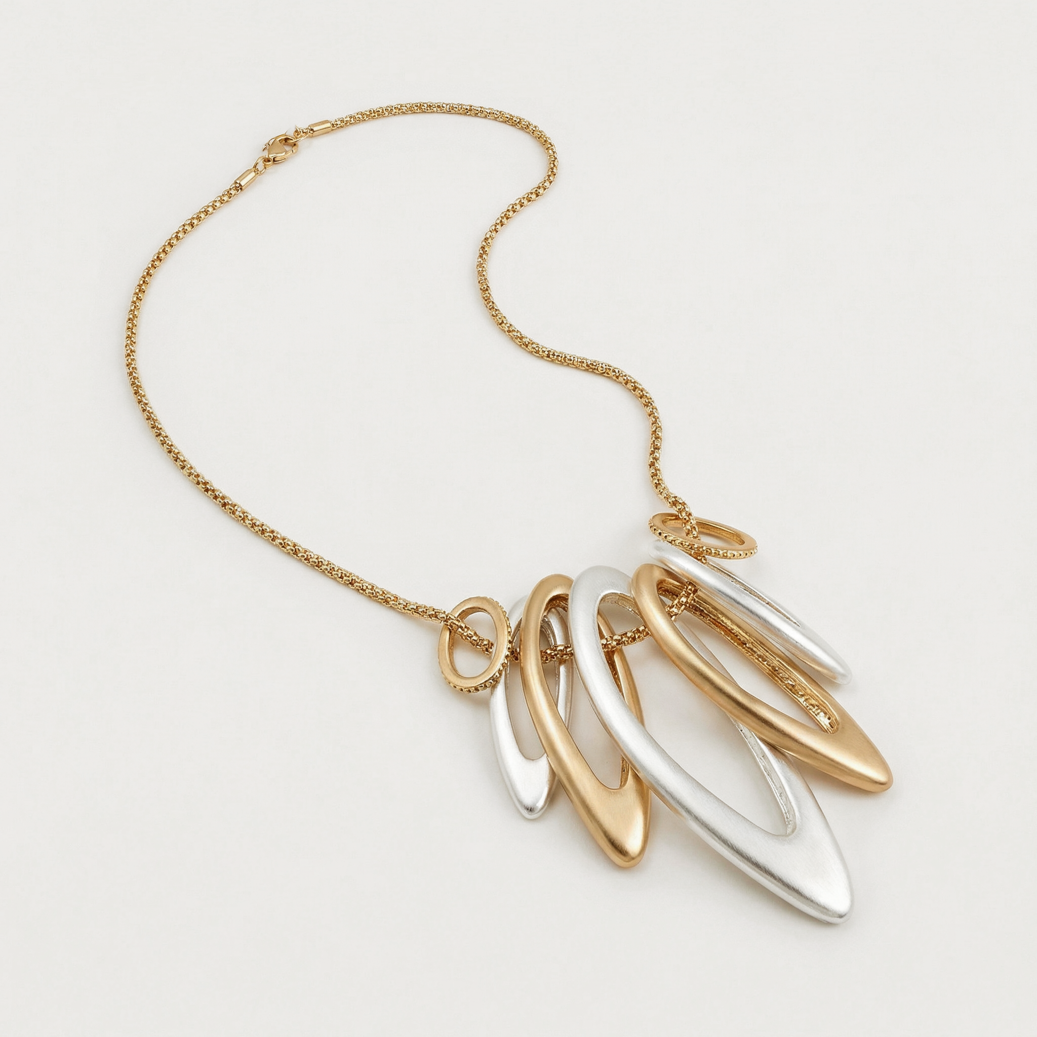 Colar longo com metal banho fosco de ouro e ródio. Níquel free.