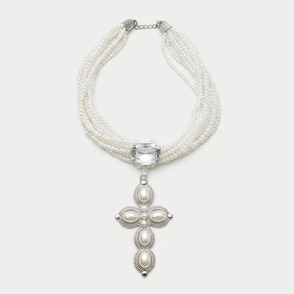 Colar em pérolas delicadas ABS e pingente em metal e pedra chaton. Níquel free.