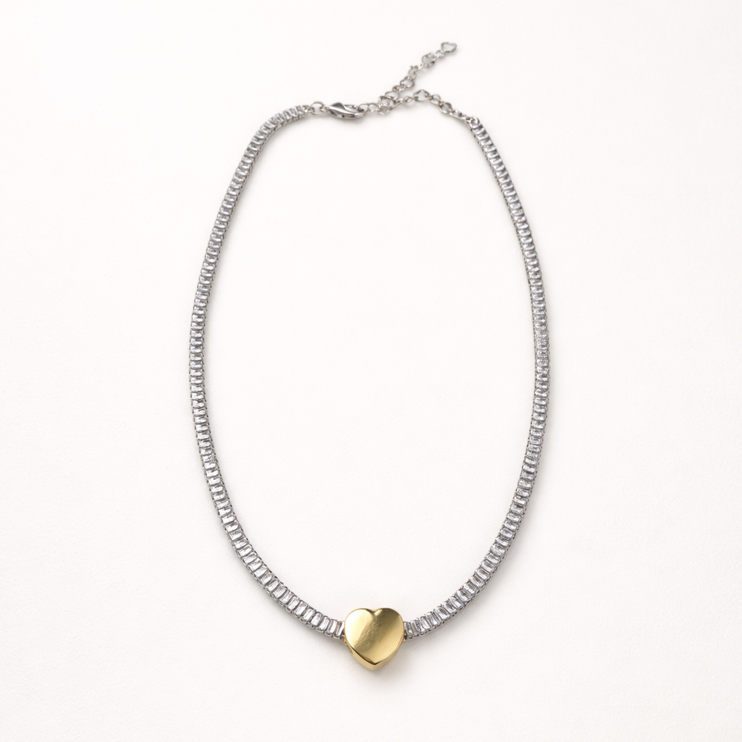 Colar com banho níquel free prateado, zirconia cravejada e pingente coração com banho ouro 18k mais camada de verniz.