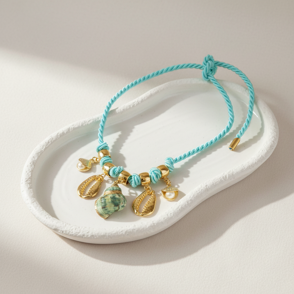 Colar confeccionado co cordão marroquino 4mm, pingentes e metais com banho triplo de ouro