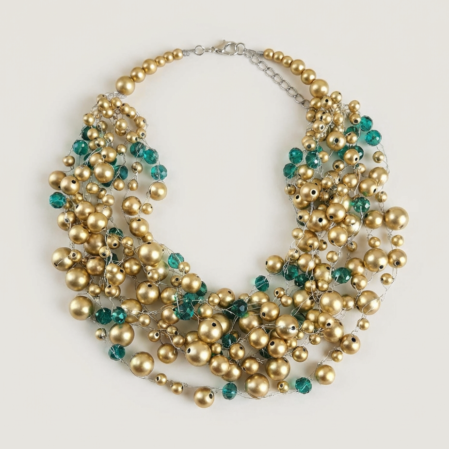 Colar confeccionado com esferas douradas fosca, cristal verde e fio cabelo de anjo.