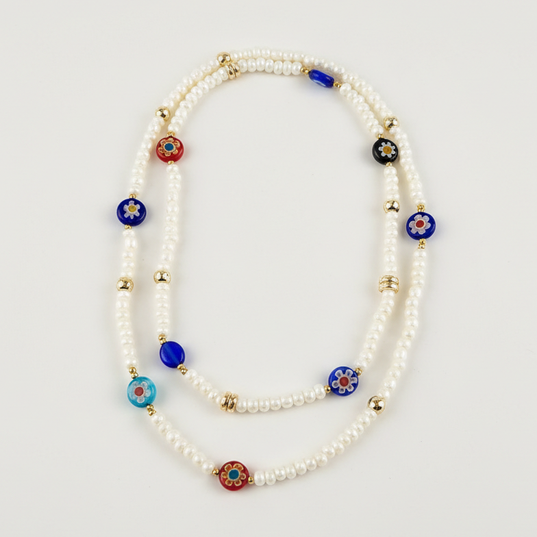 Colar em miçangas, entremeios com banho de ouro e muranos.