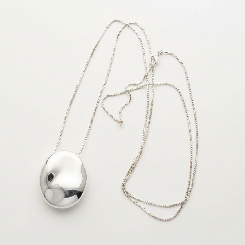Colar liso e longo composto de corrente veneziana e pingente oval com detalhe martelado, no banho fosco de ródio.