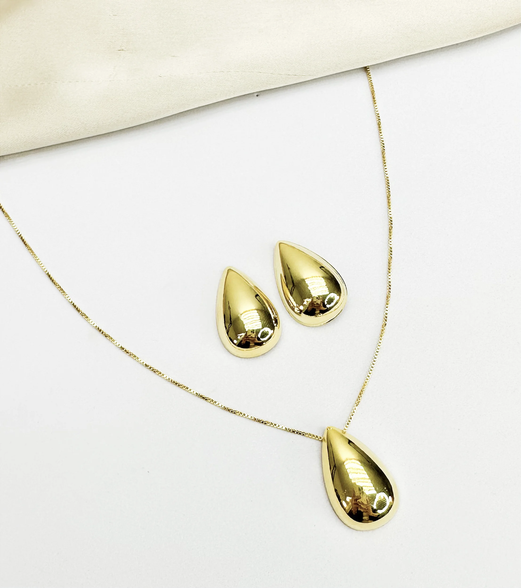 Conjunto de gota lisa no ouro. Corrente veneziana de 45cm mais 5cm de extensor.