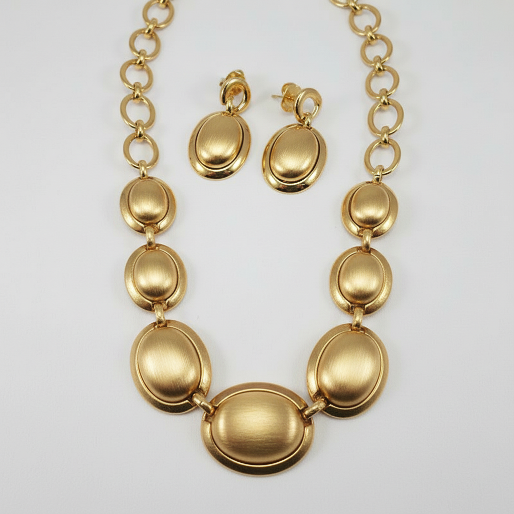 Conjunto composto de um colar e um par de brincos folheados a ouro e fosco. Comprimento do colar, 48cm. Dimensões do brinco 3,5cmx2,0cm