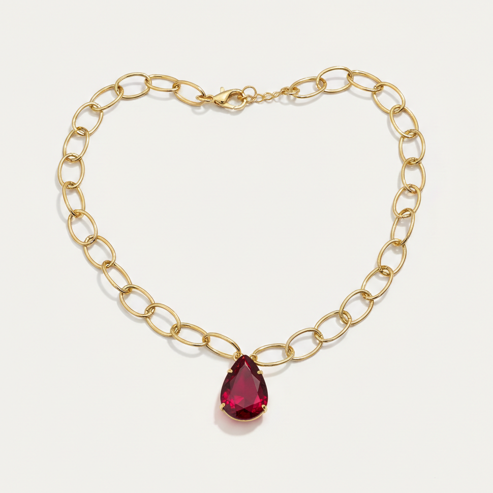 Colar confeccionadao com metal banho ouro triplo mais uma camada de verniz e gota zircônia rubilita 18x25mm.