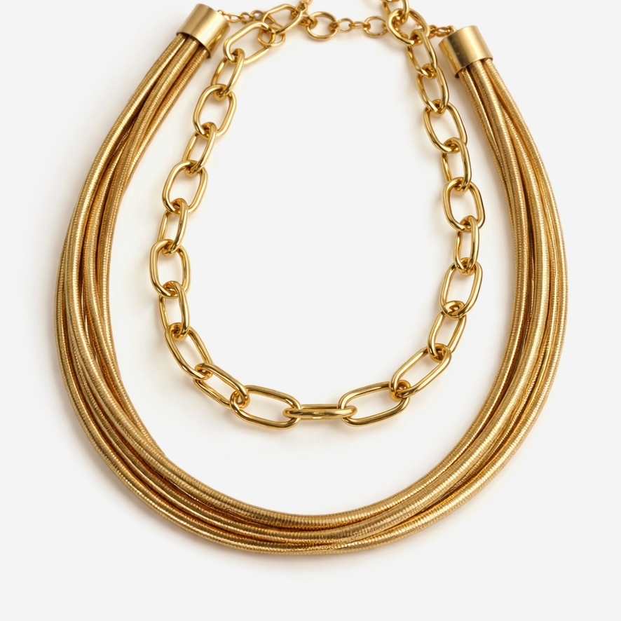 Mix Ouro composto por: Colar Jade confeccionado com metal, banho triplo de ouro e camada de verniz italiano que garante o brilho e hipoalergêrnico E Colar Bari com cinco voltas em metal maleável com banho ouro.