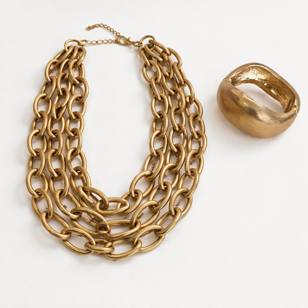Mix Ouro Fosco: Colar Creta confeccionado com corrente elos, no aluminio e acabamentos no banho triplo de ouro e uma camada de verniz italiano e Bracelete Aurora em metal com banho de ouro fosco. Níquel free.