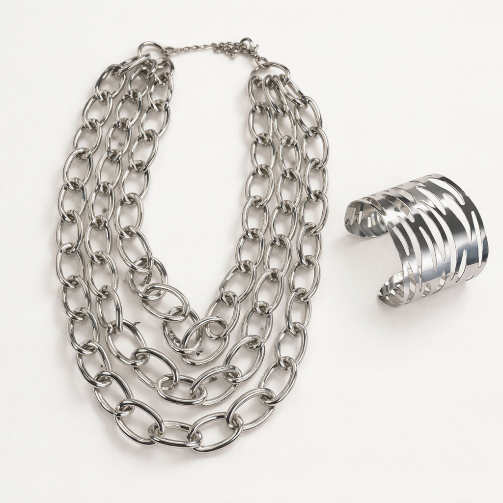 Mix Prata: Colar Creta confeccionado com corrente elos no aluminio e acabamentos no banho triplo de níquel e uma camada de verniz italiano e Bracelete Positano Prata em metal com banho de níquel. Níquel free.