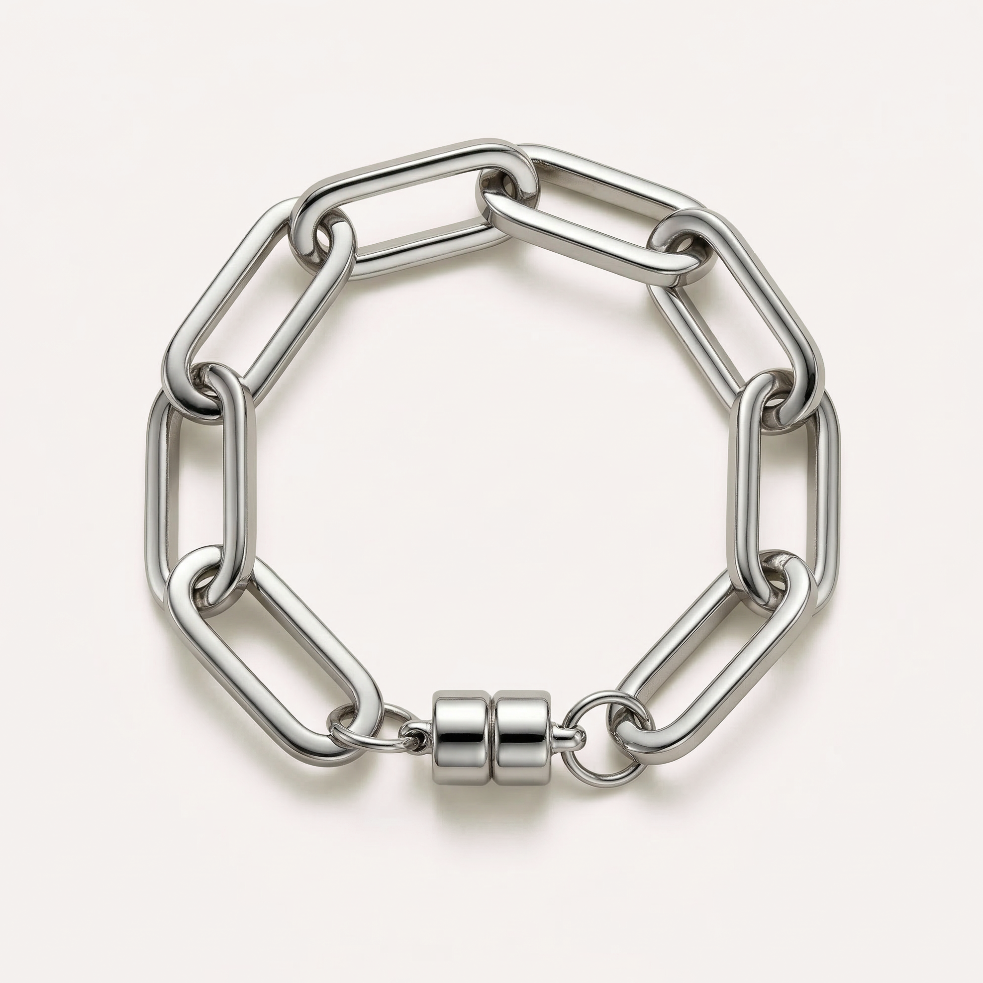 Pulseira confeccionada com corrente de elos no banho triplo na cor prata e verniz. Fecho ímã.